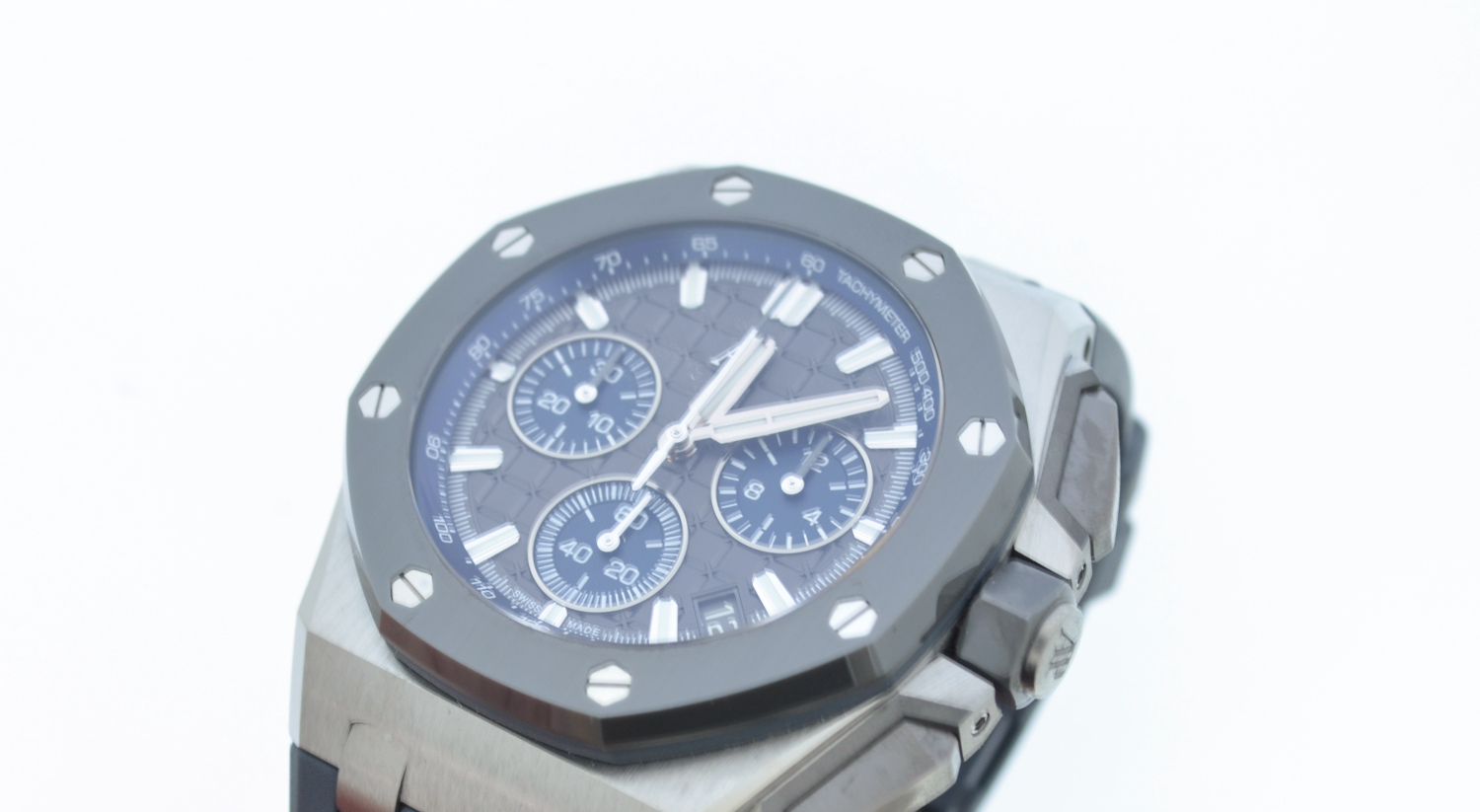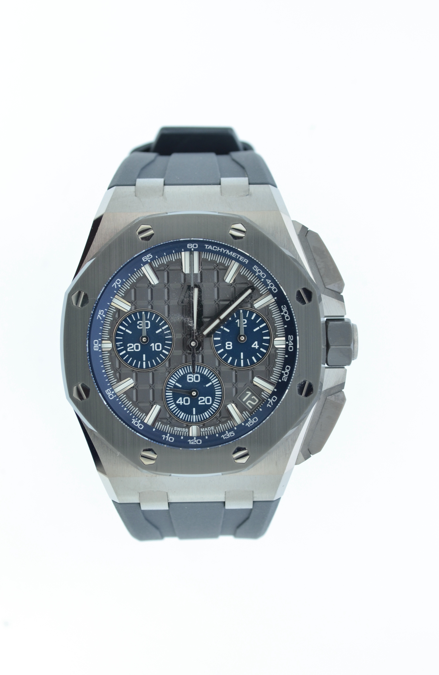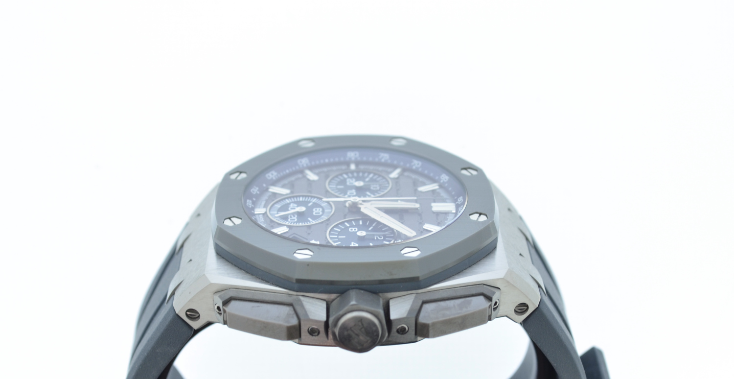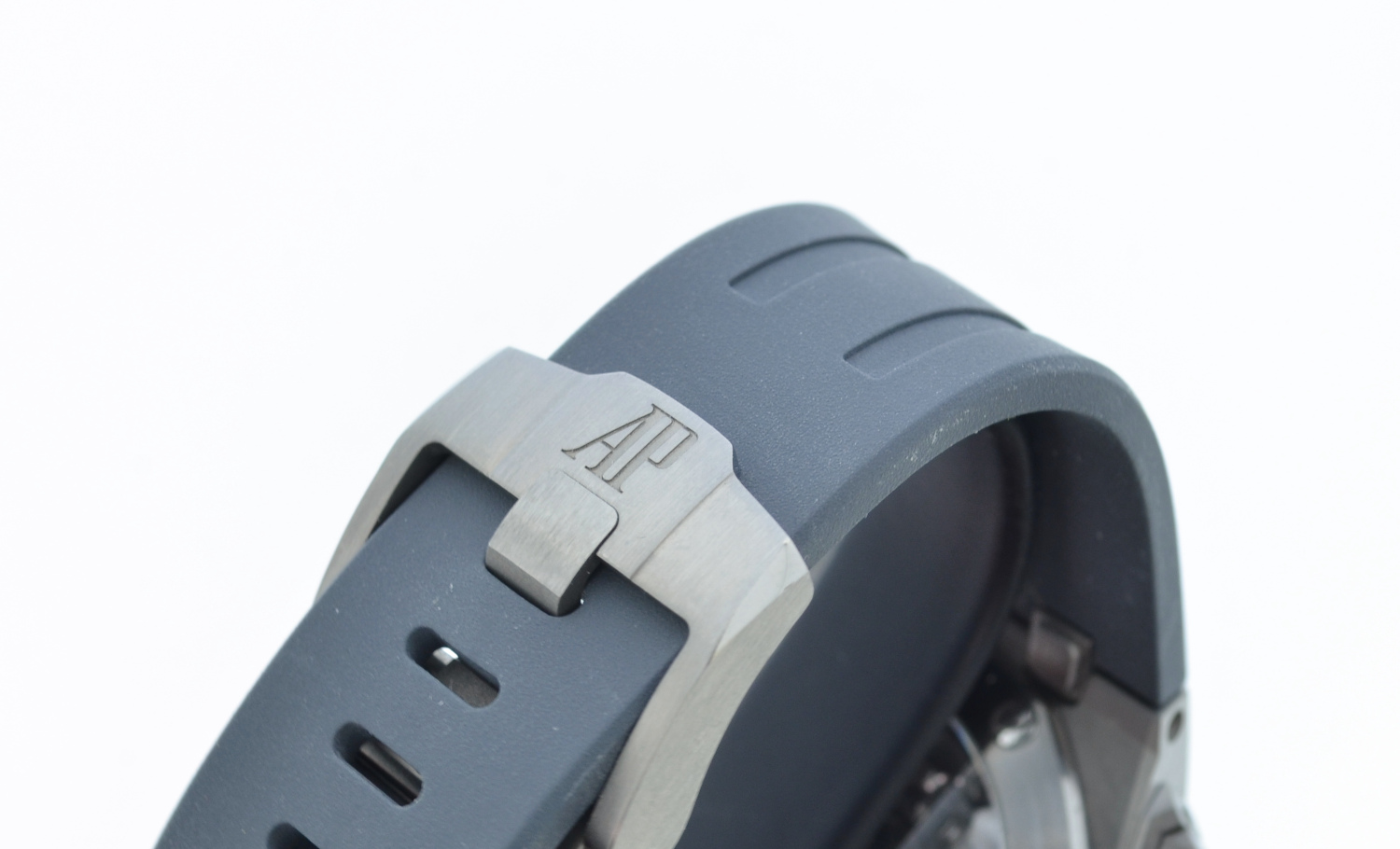 | Bracelet : | Grey rubber strap with titanium AP pin buckle and interchangeable strap system. Additional blue rubber strap |