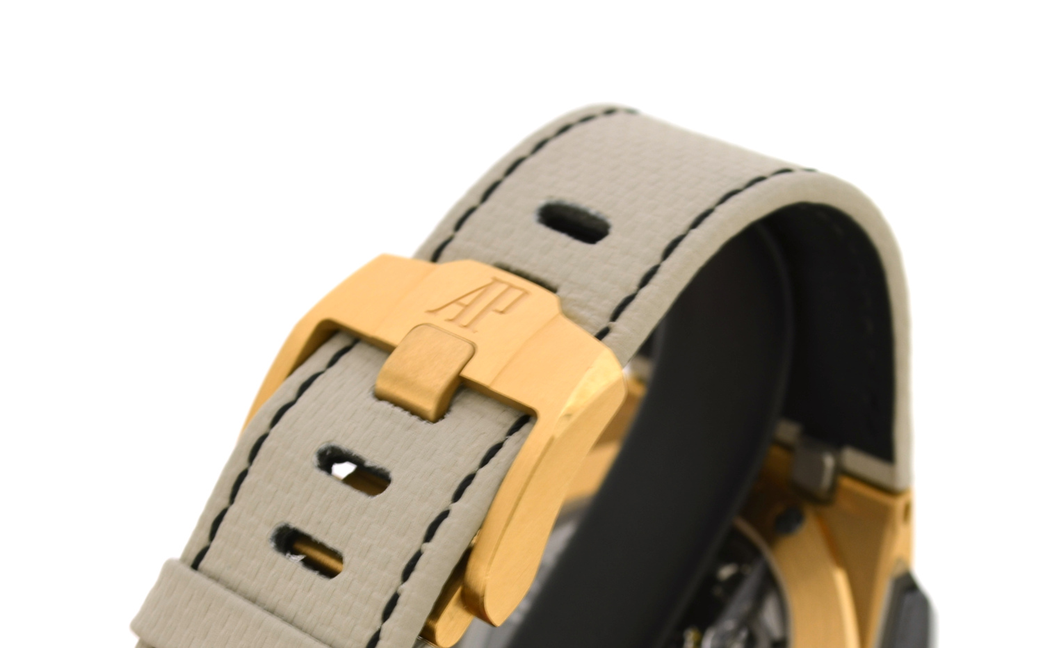 | Bracelet : | Grey calfskin strap with 18-carat pink gold pin buckle and interchangeable strap system. Additional black rubber strap |